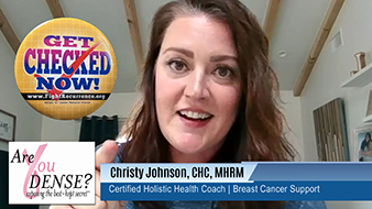 We welcome our newest member to the NYCRA circle: meet CHRISTY JOHNSON, Cancer Survivor and Holistic Health Coach from Santa Barbara, CA. Christy is committed to providing support for woman diagnosed with hormone-receptor positive breast cancer. She empowers them to make choices about their health that feel aligned. She guide them toward discovering what is stopping them from having the health they want and help them get really clear about what they do want; together, we work toward those goals. Check out her video & a short presentation on Dense Breast detection. |